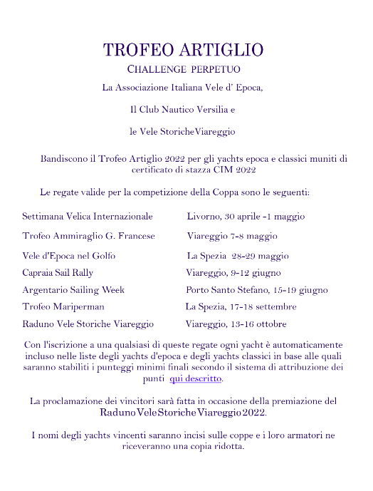 Con l'iscrizione ad una qualsiasi delle regate indicate nel bando, uno yacht e' automaticamente incluso nelle liste degli yachts d'epoca e degli yachts classici in base alle quali saranno stabiliti i punteggi minimi finali secondo il sistema di attribuzione dei punti